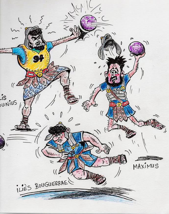 Mais avant même de franchir les palissades du village brestois, un coup du sort frappa la troupe : venu accompagner la légion, le valeureux Thomus Gineste fut terrassé par une redoutable et foudroyante grippae. Contraint d'abandonner ses légionnaires malgré lui, le fidèle centurion dut battre en retraite et regagner son lit au camp retranché d'Otelibis. Un signe des Dieux du handball, par Belenos ? Peut-être. Mais certainement pas un contretemps suffisant pour décourager les soldats bleus.